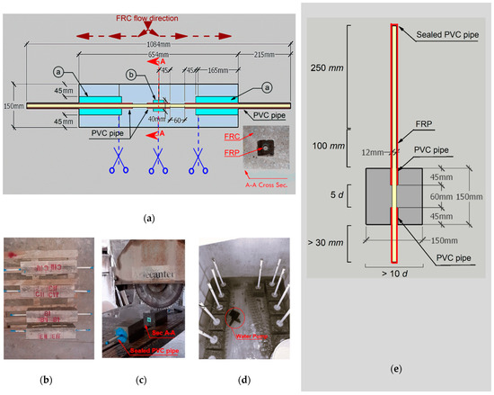 As is already mentioned in Section 3.3, the orientation of the RTSFs is influenced by the direction of concrete flow. Therefore, the mold was specifically designed to facilitate the optimal fiber orientation, i.e., 0° angle with respect to FRP rebar direction, around the bond measurement area. The formwork was constructed with an internal length of 654 mm and uniform width and height of 150 mm as shown in Figure 4a,b. The rebar was placed along the length of the mold, resulting in fiber alignment parallel to the reinforcement (see Figure 4a). Once the specimens reached a curing time of 48 h, they were demolded (Figure 4b). Following a 7-day curing period, the specimens were divided into two sections along a plane perpendicular to the rebar axis. Each section was subsequently divided further to create a cube of 150 mm side dimension (see Figure 4c). To protect the reinforcement rebar from damage, two pieces of PVC tubes (labeled as “a” in Figure 4a) with a diameter of 60 mm were placed at the ends of the reinforcement. To replicate accurately the real conditions, the unbonded FRP regions, i.e., the free end and loaded end of the specimens, were safeguarded by encasing them in PVC pipes and sealing them with waterproof epoxy. It protected the FRP reinforcement (without concrete cover) from direct saltwater exposure. Moreover, a cubic foam component (identified as “b” in Figure 4a) of 40 mm side dimension was positioned at the center of the mold. This foam was later removed to create space for installing a Linear Variable Differential Transformer (LVDT) at the free end of the reinforcement (refer to the A-A cross section in Figure 4a).
