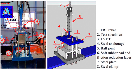 A ball joint (No. 5 in Figure 5) was incorporated at the upper end of the test setup to prevent the FRP from bending due to misalignment. The relative displacement between the FRP rebar and the FRSCC at the loading end (labeled as ‘A’ in Figure 5) was directly measured by averaging the displacements recorded using three LVDTs installed at 120° intervals around the FRP rebar on a rack. These LVDTs were utilized instead of relying on the displacement recording system of the testing machine to exclude any influence from the deformation of the test setup. Moreover, the relative displacement between the rebar and the concrete surface was monitored using an additional LVDT, placed at the free end of the rebar (labeled as ‘B’ in Figure 5).