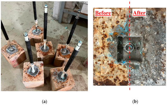 The 12 unconditioned specimens, also referred to as the control specimens, were subjected to testing after 28 days of casting. The 12 remaining specimens were tested at the termination of a 28-day curing period followed by an additional conditioning period of 24 months. A universal testing machine with a maximum load capacity of 200 kN was used to apply the static pull-out load. Throughout all static tests, the testing machine head implemented displacement control, which was operated at a predetermined displacement rate of 0.021 mm/s. This allowed us to observe the bond–slip relationship after reaching the peak load. Instrument data were recorded at a rate of 2 Hz using an acquisition system.