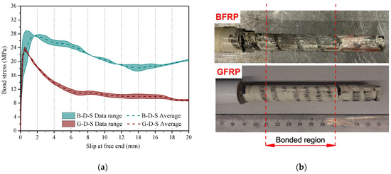 The behavior of the bond during the post-peak phase was controlled by two factors: (i) the fiber bridging effect, which limited the spreading of shear cracks, and (ii) the deterioration of the rebar’s rough surface. At approximately Av. τ = 18.14 MPa, corresponding to a slip of 14 mm, the pre-existing cracks were substantially widened, allowing the fibers to solely transmit residual stresses. Compared to the BFPR-reinforced specimens, the G-D-S specimens exhibited a reduction of 51% in residual bond stress (Av. τ = 8.83 MPa) at a free end slip of approximately 20 mm. This reduction in stress indicated the diminished performance of the GFRP in resisting further slip and load transfer.