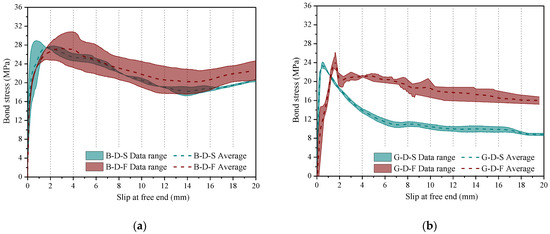 Figure 8 presents a comparison of bond-slip relationships for four specimen series: two reinforced with BFRP and the other two reinforced with GFRP rebars. The first pair of comparisons involves the bond behavior of BFRP-reinforced specimens subjected to quasi-static loading (B-D-S) with that of the specimens subjected to fatigue loading (B-D-F), as illustrated in Figure 8a. Similarly, Figure 8b compares the response of GFRP-reinforced specimens under quasi-static pullout loading (G-D-S) with those under fatigue loading regime (G-D-F).