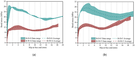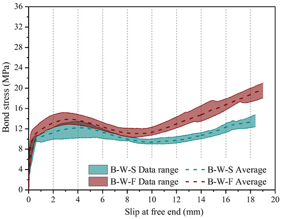 Figure 10 demonstrates the significant impact of immersion in seawater on the bond strength of BFRP-reinforced specimens, i.e., B-W-S, and B-W-F. Compared to the unconditioned specimens tested under quasi-static loading, B-D-S, a reduction of 55.7% and 53.5% was observed in the maximum and designed bond strength of the conditioned specimens, respectively, i.e., B-W-S, following the long-term immersion. The same comparison can be made by considering the bond response of unconditioned BFRP-reinforced specimens with the conditioned ones, after passing one million cycles of loading (Figure 10b). The long-term immersion of B-W-F specimens in seawater, led to a reduction in and by 49% and 29%, respectively, in comparison with those of the B-D-F specimens. Compared to unconditioned specimens, the residual bond strength of the conditioned BFRP-reinforced specimens, corresponding to 20 mm free end slip, was reduced by 33.5% and 18.8% under quasi-static and fatigue loading, respectively.