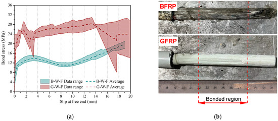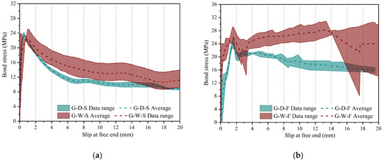 A significant scatter becomes evident after a slip of 14 mm in the GFRP rebar of G-W-F specimens, as shown in Figure 11b. This scatter is attributed to an abrupt descending branch observed in the bond stress–slip curve of two out of the three conditioned specimens, i.e., G-W-F. The probable cause for this abrupt descent was the rapid development of splitting cracks that extended to the edge of the concrete specimen in a short time. As a result, there was a sudden decrease in bond stress, which could be clearly observed. However, the specimen was not broken into parts entirely, and the surrounding concrete continued to exert a constraint effect on the GFRP rebar. As a result, the bond stress gradually increased, but it could not reach the level before the split due to energy release. It is worth noting that the concrete’s constraint effect was limited. The increase in slip under the pullout force was accompanied by further deterioration caused by the concrete split, leading to a gradual decrease in bond stress.