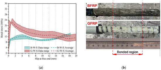 (a) Comparison of average τ-s response of BFRP-reinforced specimens with that of GFRP-reinforced specimens at normal condition, and (b) the condition of the rebars after testing the specimens.