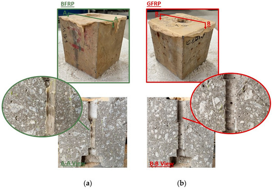 Common failure modes observed by conducting the pull-out test on specimens reinforced with (a) BFRP and (b) GFRP after prolonged exposure to seawater.