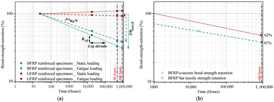 (a) Prediction of bond strength retention for 50 years of service life according to fib bulletin 40 [34] method, and (b) comparison between BFRP rebar tensile strength retention and bond strength retention for 100 years of service life.