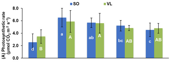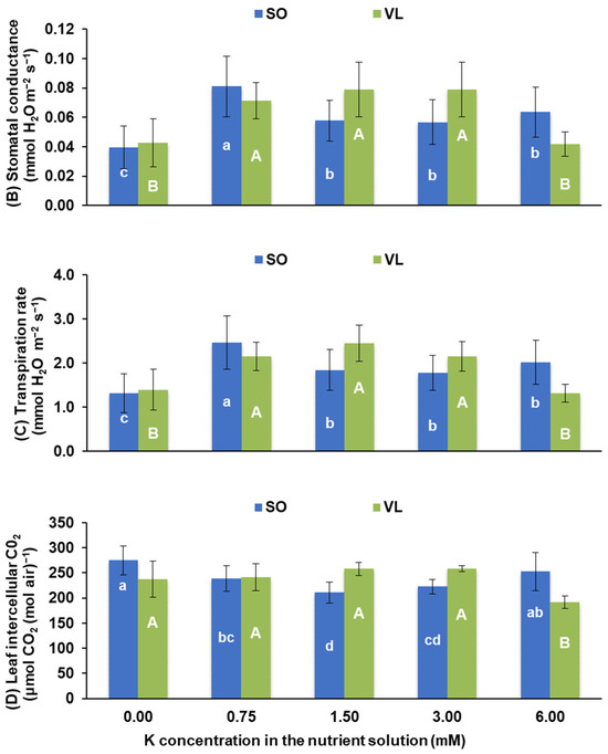 Leaf photosynthetic rate (A), stomatal conductance (B), transpiration rate (C), and intercellular CO2 concentration (D) of lemon plants (cv. Adamopoulou), as affected by K level in the nutrient solution (0.00, 0.75, 1.50, 3.00, and 6.00 mM K) and rootstock (sour orange, SO; Volkamer lemon, VL). For each parameter and rootstock, means (±S.E.), followed by different letter(s), indicate statistically significant differences, according to Duncan’s multiple range test, p ≤ 0.05, between K treatments within the same rootstock; n = 5. Particularly, in order to compare the mean values of K treatments for the SO rootstock, lowercase letters are used, while for the comparison of mean values of K treatments for the VL rootstock, capital letters are used.