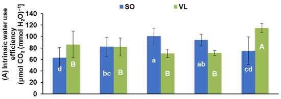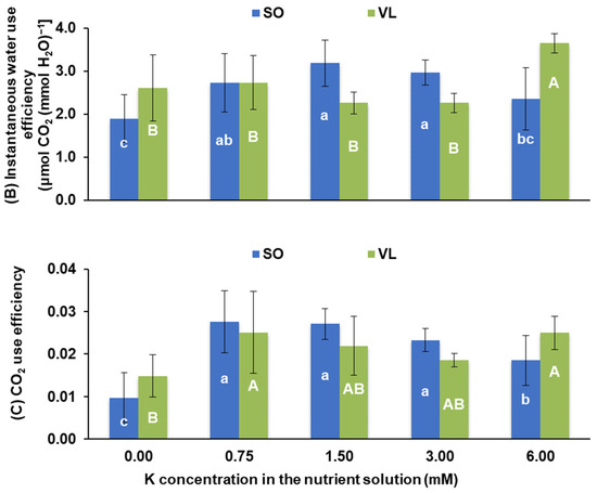 Intrinsic water use efficiency (A), instantaneous water use efficiency (B), and carbon dioxide use efficiency (C) of lemon plants (cv. Adamopoulou), as affected by K level in the nutrient solution (0.00, 0.75, 1.50, 3.00, and 6.00 mM K) and rootstock (sour orange, SO; Volkamer lemon, VL). For each parameter and rootstock, means (±S.E.) followed by different letter(s) indicate statistically significant differences, according to Duncan’s multiple range test, p ≤ 0.05, between K treatments within the same rootstock; n = 5. Particularly, in order to compare the mean values of K treatments for the SO rootstock, lowercase letters are used, while for the comparison of mean values of K treatments for the VL rootstock, capital letters are used.