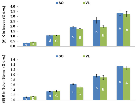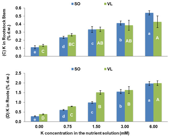 Potassium (K) concentrations (% d.w.) in leaves (A), scion stems (B), rootstock stem (C), and roots (D) of lemon plants (cv. Adamopoulou), as affected by K level in the nutrient solution (0.00, 0.75, 1.50, 3.00, and 6.00 mM K) and rootstock (sour orange, SO; Volkamer lemon, VL). For each parameter and rootstock, means (±S.E.) followed by different letter(s) indicate significant differences, according to Duncan’s multiple range test, p ≤ 0.05, among various K treatments within the same rootstock; n = 5. Particularly, in order to compare the mean values of K treatments for the SO rootstock, lowercase letters are used, while for the comparison of mean values of K treatments for the VL rootstock, capital letters are used.