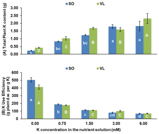 Total plant K content (quantity) (A) and K use efficiency (B) in lemon plants (cv. Adamopoulou), as affected by K level in the nutrient solution (0.00, 0.75, 1.50, 3.00, and 6.00 mM K) and rootstock (sour orange, SO; Volkamer lemon, VL). For each parameter and rootstock, means (±S.E.), followed by different letter(s), indicate statistically significant differences, according to Duncan’s multiple range test, p ≤ 0.05, among various K treatments within the same rootstock; n = 5. Particularly, in order to compare the mean values of K treatments for the SO rootstock, lowercase letters are used, while for the comparison of mean values of K treatments for the VL rootstock, capital letters are used.