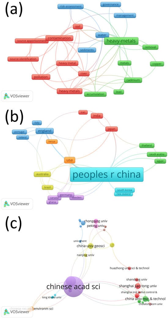 Figure 1a serves as an illustrative representation of our comprehensive analysis centered around the pivotal topic of “keywords”. Our meticulous examination has unearthed an intricate web of associations, with a particular emphasis on “heavy metals” and their pronounced connections to essential elements such as “cadmium”, “lead”, and “copper”. These discernible links shed light on the primary focal points that researchers are vigorously pursuing within their scientific endeavors. Furthermore, our investigation revealed that “heavy metals” exhibit intricate affiliations with terms like “soil”, “water”, “river”, “source appointment”, and “source identification”. These findings underscore the extensive exploration being undertaken by select scientists as they delve into the realms of various contaminated media. The scope of their research is evidently extensive and multifaceted, encompassing a wide spectrum of environmental considerations. Moreover, we observed that “heavy metals” are intricately linked to terms like “governance”, “management”, “removal”, and “risk-assessment”. This observation suggests that scientists are dedicating substantial effort and resources to the critical domain of remediation, focusing on devising strategies and methodologies for effective and sustainable heavy metal management. The significance of this focus cannot be overstated, as it has far-reaching implications for environmental preservation and public health.