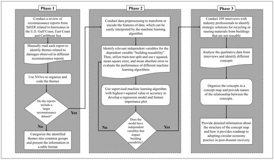 This study utilized Design Safe cyberinfrastructure [], an open-source database, to investigate damages observed in the aftermath of different hurricanes and identify factors that impact the reusability of the building after hurricane impact. The study is structured into three phases, where each phase is connected to the previous phase, as shown in Figure 1. First, the study conducted a thematic analysis of available Structural Extreme Events Reconnaissance (StEER) reconnaissance reports using NVIVO data analysis software (NVivo version 12) to code different themes that exist in the literature and map different trends related to types of damages observed in different hurricanes []. StEER is a network that works with extreme event reconnaissance organizations and the Natural Hazards Engineering Research Infrastructure (NHERI) to: (1) understand the extent of the impact of extreme events like a hurricane on the community; (2) coordinate with a network of members for early reconnaissance of disaster-affected areas to make impactful responses to disasters and accelerate the recovery process; and (3) improve community-driven standards, best practices, and policy and accelerate learning from natural disasters []. Secondly, the study focused on damages observed in 1122 buildings after the impact of Hurricane Irma in Florida available in the Design Safe database []. The authors selected the Hurricane Irma dataset because it is the only large, relevant dataset available in the Design Safe database that incorporates details about building reusability based on observed damages. The obtained large dataset is then analyzed using a machine-learning algorithm to identify different factors that impact the building’s reusability in the aftermath of hurricane impact. Lastly, the study also conducted 109 interviews with homeowners, forensic engineers, contractors, project managers, and consulting engineers, among others, to identify solutions to increase the reusability potential of buildings and salvage materials in disaster-prone zones. The obtained data were then analyzed using the concept-mapping technique. The succeeding sections discuss the procedures used for thematic analysis, machine-learning analysis, and concept mapping.