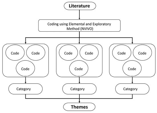 Thematic analysis is a method to identify, analyze, and interpret patterns of meaning within qualitative data []. The primary goal of thematic analysis is to construct themes to reinterpret, connect, or reframe elements of the data. The themes developed in this method are actively constructed patterns obtained from a dataset to address a research question through coding [], as shown in Figure 2. In the first stage, the literature obtained from the Design Safe database was coded using the elemental and exploratory coding approach. The elemental coding method is the first step of thematic analysis, in which a focused review of data is used for developing foundations for future coding, and the exploratory method focuses on experimental and empirical coding of the data [].