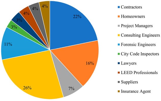 An Institutional Review Board (IRB) approval was pursued to maintain the confidentiality of any personal or proprietary information collected during semi-structured interviews from individuals that provided data to support the research effort. Semi-structured interviews are an exploratory method that relies on asking open-ended questions within a predetermined thematic framework []. This study adopted a semi-structured interview approach, because it allows for the collection of comparable and reliable data and the flexibility to ask follow-up questions and design a conceptual framework []. The authors conducted semi-structured interviews through the purposive sampling method, which is a judgmental sampling technique in which the individuals are selected to be part of the sample based on the researcher’s judgment as to which individuals would be most useful or representative of the entire population. Similarly, the snowball sampling technique was implemented to increase the reach of the project by requesting the targeted individuals to suggest other individuals with similar expertise []. The authors targeted different stakeholders who are involved in the post-disaster recovery phase to document their experience and understand the challenges of adopting deconstruction from the perspective of different professionals who play a unique role in the ecosystem. As shown in Figure 3, the authors conducted 109 interviews with stakeholders, including 18 homeowners, 29 consulting engineers, 24 contractors, 12 forensic engineers, 4 lawyers, 4 LEED professionals, 8 project managers, 3 city code inspectors, 4 building materials and tools suppliers, and 4 insurance staff who had hands-on experience with post-disaster recovery challenges, especially during extreme weather events. The interview questions mainly focused on the experience of each stakeholder during the post-disaster recovery phase, challenges related to adoption of building deconstruction, aspirations related to circular economy practices, and recommendations about effective post-disaster recovery.