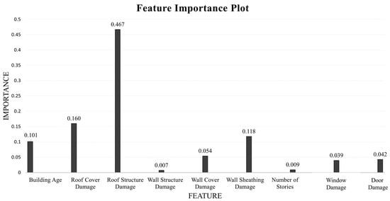 The study also developed a feature importance plot for the gradient-boosting regressor model. Feature importance values are calculated based on how much each feature in the regressor model contributes to reducing the mean square error in the model. Features that are used more often in splitting the training data in the model and lead to greater reductions in the mean square error are assigned higher importance values. As shown in Figure 4, the feature importance plot shows the most important feature for predicting building reusability. The importance of each feature in the order of decreasing importance are roof structure damage (0.467), roof cover damage (0.160), wall sheathing damage (0.118), building age (0.101), wall cover damage (0.054), door damage (0.042), window damage (0.039), number of stories (0.009), and wall structure damage (0.007). These values indicate the importance of each feature and determine the degree of usefulness of a specific feature for the current model and prediction of building reusability. If a feature has a lower value, such as that of wall structure damage (0.007), then it will have a smaller effect on the model that is being used to predict a certain variable. On the other hand, a higher value, such as that of roof structure damage (0.467), means that the extent of damage to the roof structure has the highest impact on the predicted building reusability score. These results align with the findings in the literature, which indicated that roof structure is an important factor that impacts the performance of a building during a hurricane and after hurricane impact []. Since damage to the roof structure is very common during hurricane impact, as indicated by the results of phase 1, many buildings are recommended to be demolished when they are not reusable. This traditional approach not only causes financial strain on homeowners but also overwhelms landfill sites due to the sudden inflow of disaster debris as well as demolition waste []. As such, it is critical to adopt circular economy practices such as deconstruction methods and design for disassembly principles to maximize the reuse and recycling of building components post-disaster. The information from the feature importance plot can be used to prioritize repairs and maintenance efforts for buildings in order to maximize their reusability.