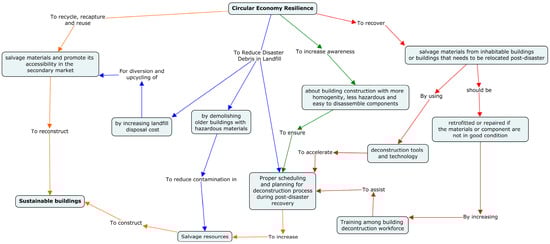 Therefore, the concept map framework shows different concepts related to strategies for achieving circular economy resilience post-disaster based on the feedback reported by interview participants. The concept map consists of four different ways of achieving circular economy resilience, which can be distinguished through color-coded arrow lines. First, the strategies guided by the orange line indicate that it is essential to promote the accessibility of salvage materials in the secondary market and to develop a proper schedule and plan for the deconstruction process. In order to achieve this objective, the strategy guided by the blue line highlights that it is important to encourage stakeholders to reduce disaster debris disposal in landfills by: (1) demolishing older buildings with hazardous materials, such that this would reduce contamination of salvage materials; (2) recovering salvage materials by proper scheduling and planning for the deconstruction process; and (3) increasing landfill disposal cost to encourage diversion and upcycling of salvage materials.