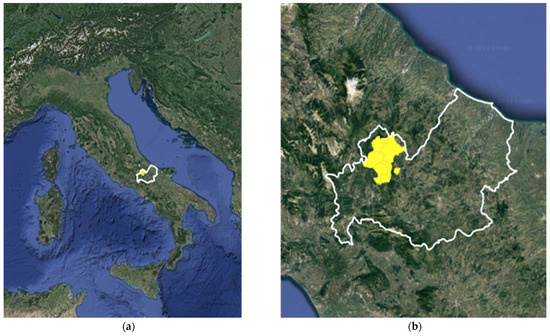 Italy and, within the white border, the Molise region (a), the Molise region within the white border and the research area in yellow (b).