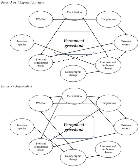 The respondents also identify interactions among the drivers of change that affect the reference variable. Still, the data seem to confirm that “lay” actors and experts, with their specific knowledge and epistemology, use different resources to interpret the systemic socio-ecological complexity (Figure 2 and Table 8). Experts, for example, report a relatively simple pattern considering how a shift in the rainfall regime has adverse effects on the physical state of the soil and influences the land-cover change. At the same time, the land-cover change can not only have a worsening indirect effect on the state of the soil because of a change in the vegetation, but due to depopulation, the effects of extreme events could worsen, which could also directly favor the spread of pests and invasive species. In this sense, experts identify the main problem caused by climate change with two parameters (temperature and precipitation), in particular, which compromise the natural resources, and identify depopulation as an incremental factor in the negative effect of climate change. In short, experts and advisers assume an “analytical” scheme to explain the effect of climate change. Farmers and cheesemakers, conversely, consider the effects of global warming with no plain correlation patterns, and the indirect effects of some drivers are not reported. However, they stress the relevance of demographic changes affecting the main natural resource related to the local value chain and the specific effect of some drivers. It seems in this case, that these actors propose a “holistic” image related to the change in the mountain area.