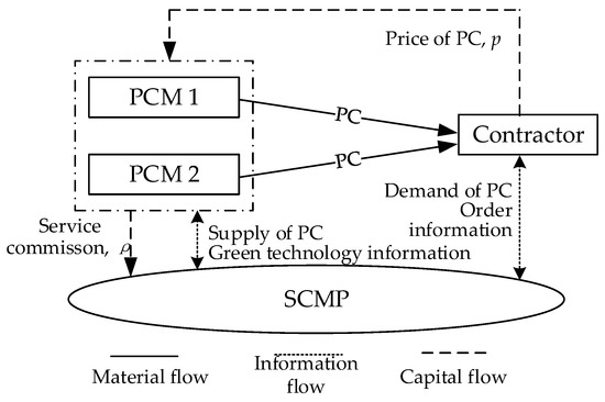Based on an SCMP, a PBSC composed of PCMs and the contractor is constructed, as shown in Figure 1. The SCMP provides technical support for information interaction and charges service commission . Competitive PCMs provide alternative prefabricated components to the contractor, and the green technology level of PCMs is . (The green technology level of prefabricated-component manufacturers is reflected by green manufacturing technology, environmental research capability, information technology level, green culture, etc.) PCMs need to bear costs to improve the green technology level, and part of it is the input cost of improving the level of green technology, denoted as [30,39], where represents the cost parameter of green technology. In addition, PCMs need to conduct technology testing to prove that their green technology level is in line with the relevant information displayed on the SCMP. Examples include recognition by environmental organizations, proof of resource efficiency per unit of product, and carbon emissions, and this part of the cost is denoted as , where represents the marginal cost of green technology upgrading.
