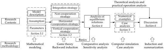 Based on the operation model and assumptions, four cooperation strategies are examined in the following subsection. The research contents and methodology are presented in Figure 2 to show the research process of this paper.