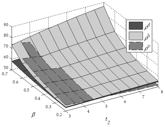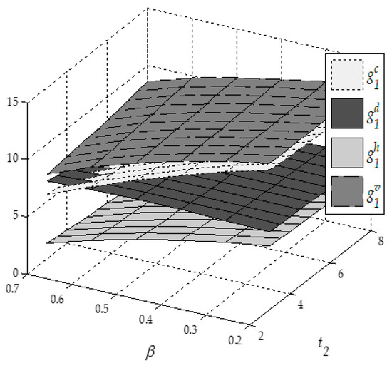 Since expressions of equilibrium solutions under vertical cooperation strategies are complicated and it is more difficult to obtain intuitive conclusions, this section analyzes different cooperation strategies comparatively with numerical examples. Let and , and be independent variables, , and . The changes in equilibrium solutions with and are shown in Figure 3, Figure 4, Figure 5, Figure 6, Figure 7, Figure 8 and Figure 9.