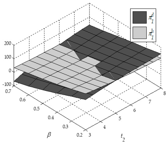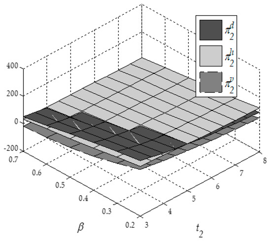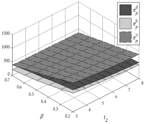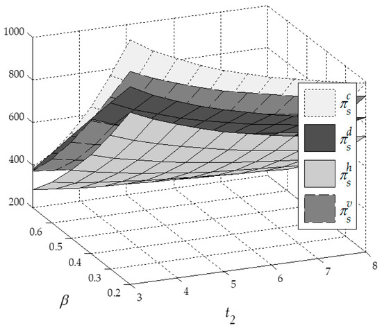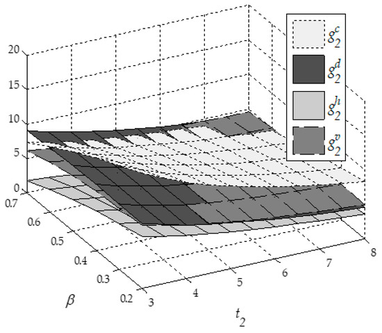 From Figure 4, it can be seen that the green technology level of PCM 1 is the highest when PCM 1 cooperates with the platform and the competing PCM 2 does not participate in the cooperation. Moreover, when the competition coefficient is higher than a certain threshold (), the green technology level of PCM 1 under the non-cooperation strategy will be higher than the green technology level under the integration strategy. Figure 5 shows that the green technology level of PCM 2 under the integration strategy is the highest when the intensity of competition is low, but when the competition is intense, the green technology level of PCM 2 under the vertical cooperation strategy is the highest if the cost parameter is large (); it is the highest under the non-cooperation strategy if the cost parameter is small (). In the case of fierce competition but a large cost parameter, PCM 2 still maintains the highest green technology level under the vertical cooperation strategy, which is not favorable for the long-term development of PCM 2. Since the competition is fierce and improvement cost is high, the pursuit of improving the green technology level will lead to the inability to make profits, which affects the long-term development of the firm. Therefore, to improve the green technology level of PCMs, PCMs and platforms should strengthen cooperation, adopt an integration strategy, and make decisions to maximize the profit of the supply chain system.