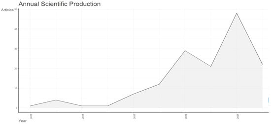 A total of 163 articles were found in the Scopus database accessed on 21 December 2022. The search was limited to document type (research article and review), source type (journal), language (English), and year of publication (2013 to 2022). Full-text articles were considered for analysis. The data for the bibliometric analysis were collected from the Scopus database and exported in a “.csv” (Microsoft Excel) format for use []. Scopus was selected as the database for extracting the articles for this study because it is the largest database of intellectual papers and is considered the most acceptable choice among the various multidisciplinary databases [,,].