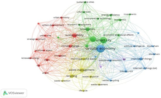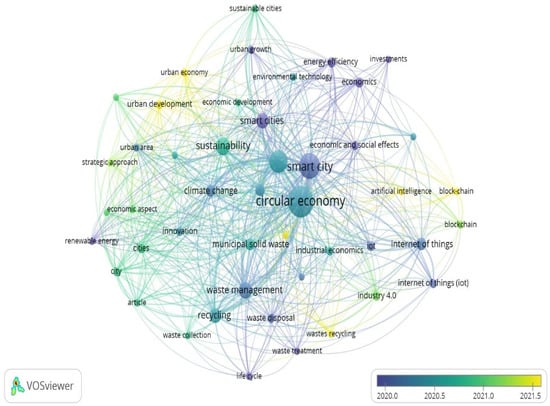 The overlay visualization in smart cities and circular economies is shown in Figure 3. The update for each phrase is displayed in the visualization overlay. The uniqueness of each phrase is indicated by its color. The area’s level of impact increases with color brightness. Circular economies and smart cities are the current research hot topics. Consequently, this could be a crucial subject for future research to identify various themes associated with smart cities and the circular economy.