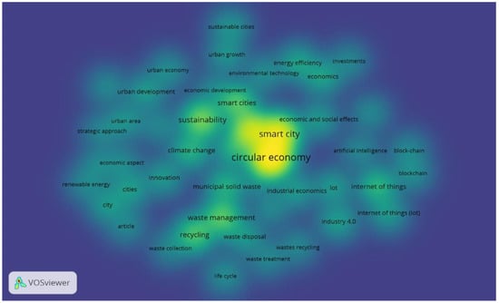 According to the density visualization shown in Figure 4, the more frequently a term appears, the darker or brighter the yellow hue is, and the larger the diameter of the term’s circle. This indicates that there are more studies being conducted on relevant topics. There will be fewer studies on a phrase as its color ages and becomes more similar to the background color. According to Figure 4, many studies have been conducted on smart cities, the circular economy, sustainability, waste management, recycling, climate change, artificial intelligence, blockchain, Internet of Things, and their economic and social implications. According to the results of the data mapping of the articles gathered, the keywords that most frequently appeared are the circular economy, smart city, recycling, waste management, Internet of Things, blockchain, and sustainability. We can use this information to search for smart cities and circular economy studies.