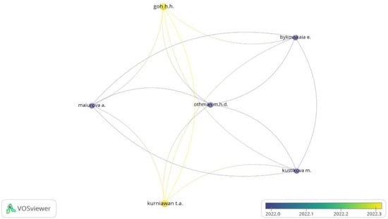 The authors, connected institutions, and countries that publish on circular economies and smart cities were examined using the function module of VOS viewer’s coauthorship visualization. The threshold value for the minimum number of documents was set at two, and the minimum citation was left at one to make it simple to identify the well-known authors who had made contributions in the form of publications in this field. Some of the 551 authors, however, were not linked to the other writers in the network. Only 26 authors met the criteria as shown in Figure 6.