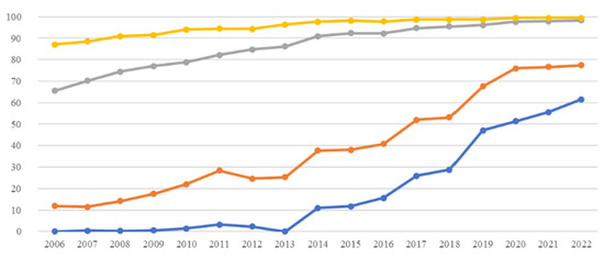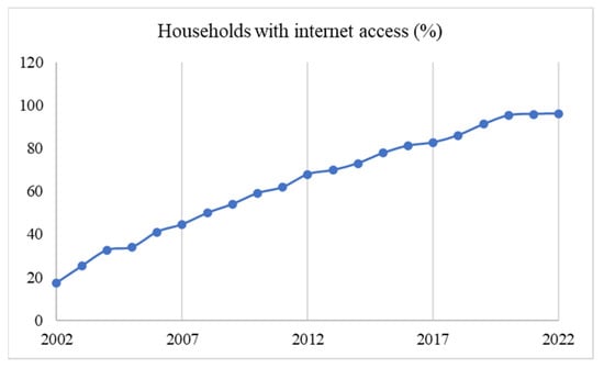 These results show the increasing percentage of households using the internet in Spain (Figure 1). In this way, in the last 20 years, the percentage of internet access increased by 78.70%, from 17.40% in 2002 to 96.10% in 2022, while, in the last 10 years, households with internet increased by 28.20%, from 67.90% in 2012 to 96.10% in 2022. As of 2009, more than half of Spanish households owned the internet and, since 2019, more than 90%, reaching almost all Spanish households in 2022.
