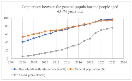 On the other hand, there is a much lower percentage of older people using the internet compared to the internet use of the general population. Although internet use by this sector of the population has increased over the years, it has ranged from 5.10% to 76.40% since 2006. Thus, it is always differentiated from the general population, creating its greatest approach from the year 2019 (Figure 2). In addition, the data of people over 75 years old are offered from 2019, obtaining rates between 23.40% and 35.90%. In Table 3, we can observe that the difference between internet use by the general population and the use of the population aged 65–75 began to be 48.30% in 2006 and has decreased to 18.10% in 2022.