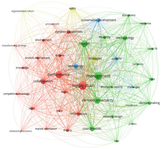 | Demand uncertainty (Green color) | Absorptive-capacity, complexity, coordination, cost, COVID-19, decision-making, demand uncertainty, disruption, flexibility, investment, management, methodology, model, network design, policies, resilience, risks |