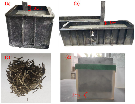 MCMM specimens: Firstly, well-mixed ordinary cement concrete material was placed in a mold and compacted via vibration to achieve density. Then, a 3 cm thickness was reserved for the microwave absorption functional layer. The preparation of the test specimens is shown in Figure 1a,b. A galvanized iron wire mesh was placed in the mold, followed by pouring and compacting the microwave-absorbing functionality layer containing magnetite material.