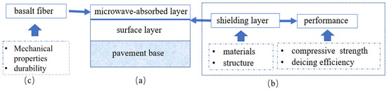 Design method for microwave-absorbing pavement structure. (a) Pavement structure, (b) shielding layer design, (c) basalt fiber reinforcement.