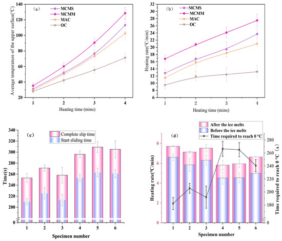 The outdoor de-icing test results are shown in Figure 4d. The analysis revealed that under an initial temperature of −20 °C, it takes approximately 193 s for the surface temperature of the MCMS structure specimen to rise to 0 °C, with a heating rate of 6.25 °C/min. However, it takes approximately 257 s for the surface temperature of the MAC structure specimen to reach 0 °C, with a heating rate of 4.68 °C/min. In the outdoor de-icing test, the heating rate of the specimens was significantly lower compared to that in the indoor de-icing test. This phenomenon can be attributed to the heating conditions in the indoor de-icing test, where the specimens were placed inside a microwave cavity. The microwaves that were not absorbed by the specimens underwent reflection within the cavity and were reabsorbed by the specimens. Additionally, the microwave cavity is a closed environment, which reduces heat loss. As a result, the heating rate of the specimens in the indoor de-icing test was much higher than that in the outdoor de-icing test. Furthermore, the presence of ice layers on the specimen surfaces also had a significant impact on the heating rate.