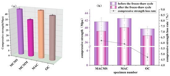 The experimental results of the microwave-absorbing concrete specimens without basalt fiber are shown above the 0-axis in Figure 6a, while those for the specimens with basalt fiber are shown below the 0-axis. The right axis represents the strength loss rate of the specimen structure type before and after the freeze–thaw cycles. First, we analyze the change in compressive strength of the specimens before and after the freeze–thaw cycles. The compressive strength of the OC specimen after freeze–thawing decreased by 2.51 MPa, or about 6.0%, compared to before freeze–thawing. The compressive strength of the MCMS structure cube specimen decreased by 3.95 MPa, or about 8.5%, compared to before freeze–thawing. The compressive strength of the MAMB specimen decreased by 3.56 MPa, or about 7.3%, after experiencing microwave freeze–thaw cycles. The compressive strength of the MAC structure cube specimen without fiber decreased by 3.55 MPa, or about 7.9%, after freeze–thawing compared to before freeze–thawing. The compressive strength of the MAB specimen decreased by 2.59 MPa, or about 5.5%, after experiencing microwave freeze–thaw cycles. Afroz and Shu et al. [30,31] discovered that basalt fibers exhibit good compatibility with cement. When added to concrete, these fibers can significantly enhance strength and elastic modulus while also increasing toughness and improving durability.