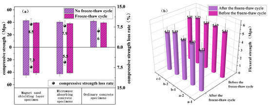 Mechanical properties of specimens before and after freeze–thaw cycles. (a) Compressive strength; (b) flexural strength.