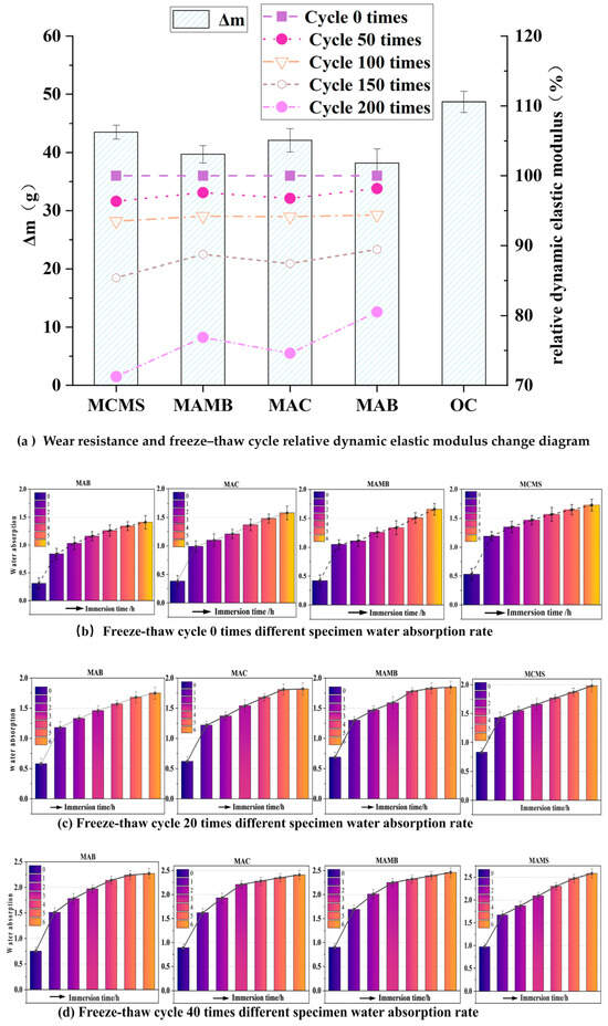 The results of the abrasion resistance experiment for the OC, MAMB, MAC, MAB, and MCMS specimens, as well as the relative dynamic modulus of elasticity after different numbers of freeze–thaw cycles, are shown in Figure 7a. A total of 200 freeze–thaw cycles were conducted on the specimens, and the relative dynamic modulus of elasticity was recorded every 50 cycles, as shown in Figure 7a. When the specimens of different types underwent 0 freeze–thaw cycles, the water absorption rate varied over time, as shown in Figure 7b. After 20 freeze–thaw cycles, the water absorption rate varied over time, as shown in Figure 7c. After 40 freeze–thaw cycles, the water absorption rate varied over time, as shown in Figure 7d. Ogut et al. [33] found that adding basalt fibers can enhance the durability of concrete.