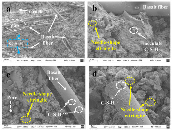 SEM experiments were conducted on specimens containing basalt fibers, and the results are shown in Figure 8.