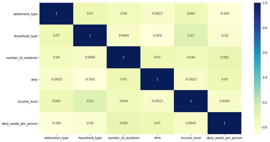 Based on the analysis of interrelationships between the factors determining the daily volumes of organic waste generation by households per capita, it can be said that there are no close interrelationships between the factors. For a more detailed analysis, we built a correlation matrix with a heat map, which reflects the quantitative values of the correlation coefficients between the factors that determine the daily volume of organic waste generation by households per capita (Figure 4).