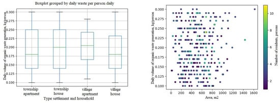 It was established that there are no close correlations between individual factors that determine the daily volume of organic waste generation by households per capita. In particular, the highest correlation coefficient is between the type of housing and the income level of household residents, which is 0.13. Regarding the daily volume of organic waste generated by households per capita, the number of residents and the occupied area of the home territory have the greatest influence. For a more in-depth analysis, dependencies between the specified factors were constructed (Figure 5).