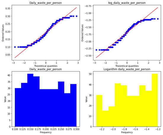 We constructed quantile–quantile (Q-Q) graphs for daily volumes of organic waste generation by households per capita (Figure 7).