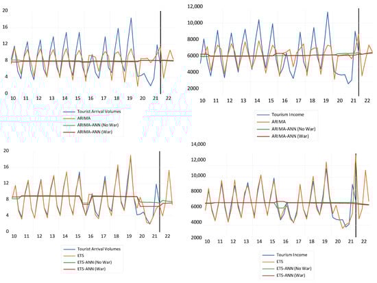 Accurate forecasting of tourism demand and income holds paramount importance for both the tourism industry and the national economy. This study aims to address several objectives: (1) specify the best forecasting model in the prediction of tourist arrival volumes and tourism income for Turkey; (2) assess the degree of impact exerted by various determinants on the tourism forecasts; (3) generate forecasts for tourist arrival volumes and tourism income using the most suitable models; and (4) examine potential scenarios illustrating the ramifications of the Russia-Ukraine war on tourist arrival volumes and tourism income. The forecasting models employed in this study encompass a comprehensive set of statistical methods, including ETS, ARIMA, TRAMO-SEATS, X13, X11, STL, Grey, and their combinations with ANN. In the ANN models, exogenous variables such as the global financial crisis, the Turkey-Russia warplane crash crisis, the COVID-19 pandemic, and USD/TRY exchange rates are incorporated. The results unveil the identification of five superior models: ETS, Grey, hybrid ETS-ANN, hybrid Grey-ANN, and hybrid ARIMA-ANN models, which exhibit the lowest MAPE and sMAPE values. Forecasts for the forthcoming quarters are examined under two scenarios: assuming the continuity or cessation of the Russia-Ukraine war. Comparative analysis of the relative effects of exogenous variables indicates that COVID-19 has the most substantial impact on tourist arrival volumes, and tourism income is primarily influenced by the USD/TRY exchange rate.