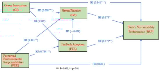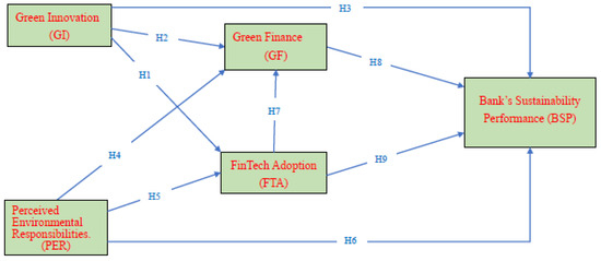 In their study on financial technology in Malaysia, Ref. [51] demonstrated that FTA is driven by the perceived behavioral control of TPB and indicated an impact between the two. According to Ref. [52], recent research in South Africa shows that PER has significant impact on FTA. However, Ref. [53] found that it has not yet been concluded whether there is a mutual influence between sustainability performance and environmental perception of responsibility. Ref. [54] found that information based on increasing severity will indeed increase individuals’ willingness to mitigate their impact on climate change. Financial technology relies on green financial technology applications such as blockchain, artificial intelligence, big data, cloud computing, and internet finance that contribute to the achievement of sustainability goals in the banking industry [55]. In the past decade, there has been GI brought about by fintech, which is prompting the large banking industry to ramp up its investments in IT; for example, by 2019, fintech was the most advantageous investment for banking institutions [56] as was the adoption of financial technology integrates investments in green innovation technology within the banking industry. It facilitates the transformation of the banking industry and has significant impact on the overall economic and social sustainable transformation through the balance of financial inclusion and sustainable development [57]. FTA enhances the profitability, competitiveness, and BSP, thereby influencing financial sustainability development [58]. Therefore, the research hypotheses H5 and H6 are formulated as follows: