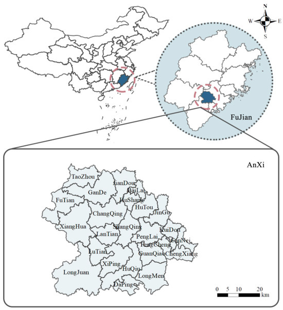 Anxi County (24°50′–25°26′ N, 117°35′–118°17′ E) is in the southeastern Fujian Province in China and has an area of 3057.28 km2 (Figure 1). It is in the central and southern subtropical maritime monsoon climate zone and has abundant sunshine (1850 h per year), sufficient rainfall (1500–2000 mm), and an average annual temperature of 16.0–21.0 °C. Its geomorphological types are complicated and diverse, and the terrain differs greatly between the east and west parts of the county. Also, a dense network of rivers and abundant water resources include the Jinjiang River basin water system in the eastern part of the county and the Jiulongjiang River basin in the western part. Together, they account for 64.8% and 35.2% of the county’s river basin area, respectively. The southern part of the county is subtropical rainforest and the middle is subtropical evergreen broad-leaved forest.