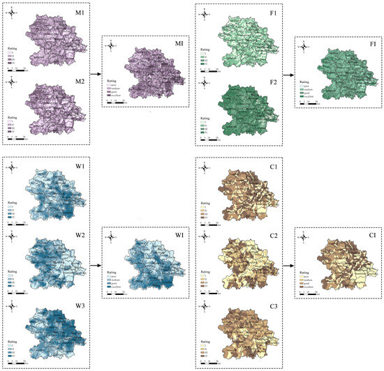 While W1 and W3 have similar spatial distribution characteristics, their higher grades were in Penglai, Guanqiao, Longmen, and Daping in the eastern part of the county (Figure 4). The grades were lower, especially for W1, in the northwest. Meanwhile, W2 had high grades in only small areas in Xianghua, Xiping, and Daping.