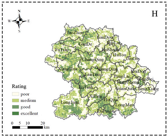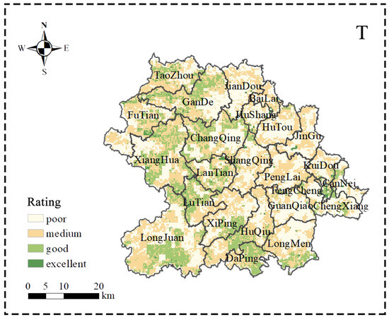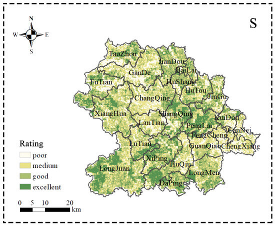 In general, the mountain ecosystem is rated highly, but its composite index has no obvious spatial distribution pattern (Figure 4). Specifically, the central and eastern areas of the county (e.g., Changqing, Hutou, Guanqiao, and Longmen) have more “excellent” ratings than the other areas do. That part of the county has a gentle topography, so the frequency of natural disasters is relatively low. Areas rated “poor” are scattered throughout the study area, but there is a large area in Futian, Gande, and Taozhou. This type of area has a higher risk of safety hazards in the event of geological disasters such as landslides and mudslides.