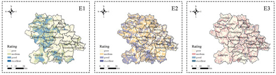 In general, we found no distinct pattern in the spatial distribution of the integrated key ecosystem characteristics (Figure 5). Anxi County had large areas rated “medium”, while the “excellent” rating applied to a small area, mainly in the centre of the county (e.g., Shangqing and Penglai) and in small parts of Longjuan, Lutian, Huqiu, and Longmen in the south. Also, areas with “poor” ratings were scattered throughout the county. Overall, most of the county was rated “poor” and “medium”, thus indicating that the county’s ecosystems possess a low ability to regenerate after sustaining damage.