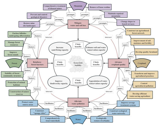 The interactions among these ecological problems have intensified water and soil losses and created fragile shelterbelt forests, severe water pollution loads, and degraded cropland. Ultimately, the results of those interactions further contribute to a reduced ES capacity and overall ecosystem instability (Figure 2).
